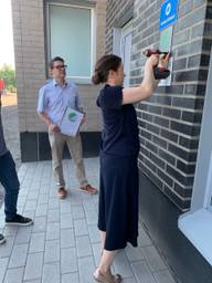 VAV-konsernin toimitusjohtaja Mirka Saarholma poraa Joutsenmerkki-laatan.